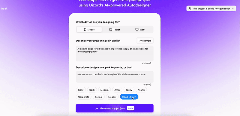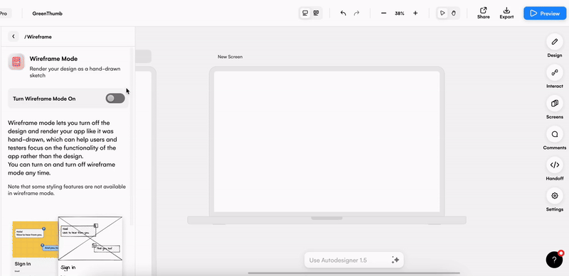 You can generate a low-fidelity wireframe from a text prompt thanks to Autodesigner. Simply enter your prompts, and then use the ‘hand-drawn’ keyword to transform your generation into a low-fidelity website wireframe.