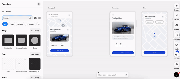 With handoff mode you can export assets such as components and entire design screens, and you can even copy the code for a component of your choosing. With both CSS and React code options, you can go from design to development at the click of a button.