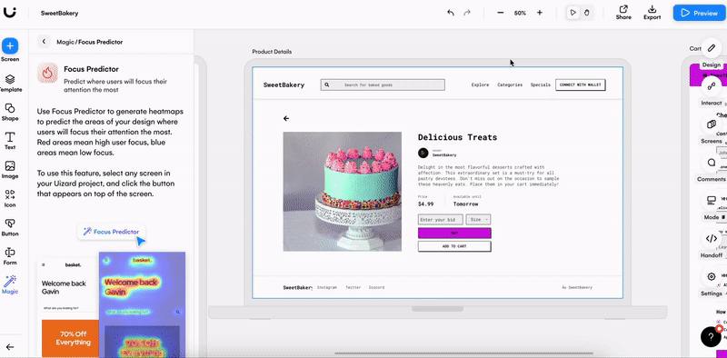 And with Uizard you can supercharge your discovery process. Easily ideate and validate your design using a whole range of AI-powered features such as Screen Generator and Focus Predictor, or gain inspiration from pre-designed templates to speed up your process.