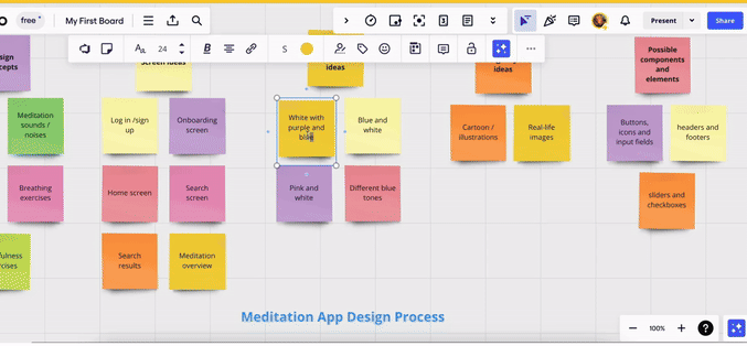 Miro is an example of a collaborative ideation tool that is great for product managers and their teams. Miro can be used for user journey maps, and for facilitating workshops via the whiteboard feature. Here a variety of templates, as well as add-ons such as sticky notes can help to document internal or external feedback.