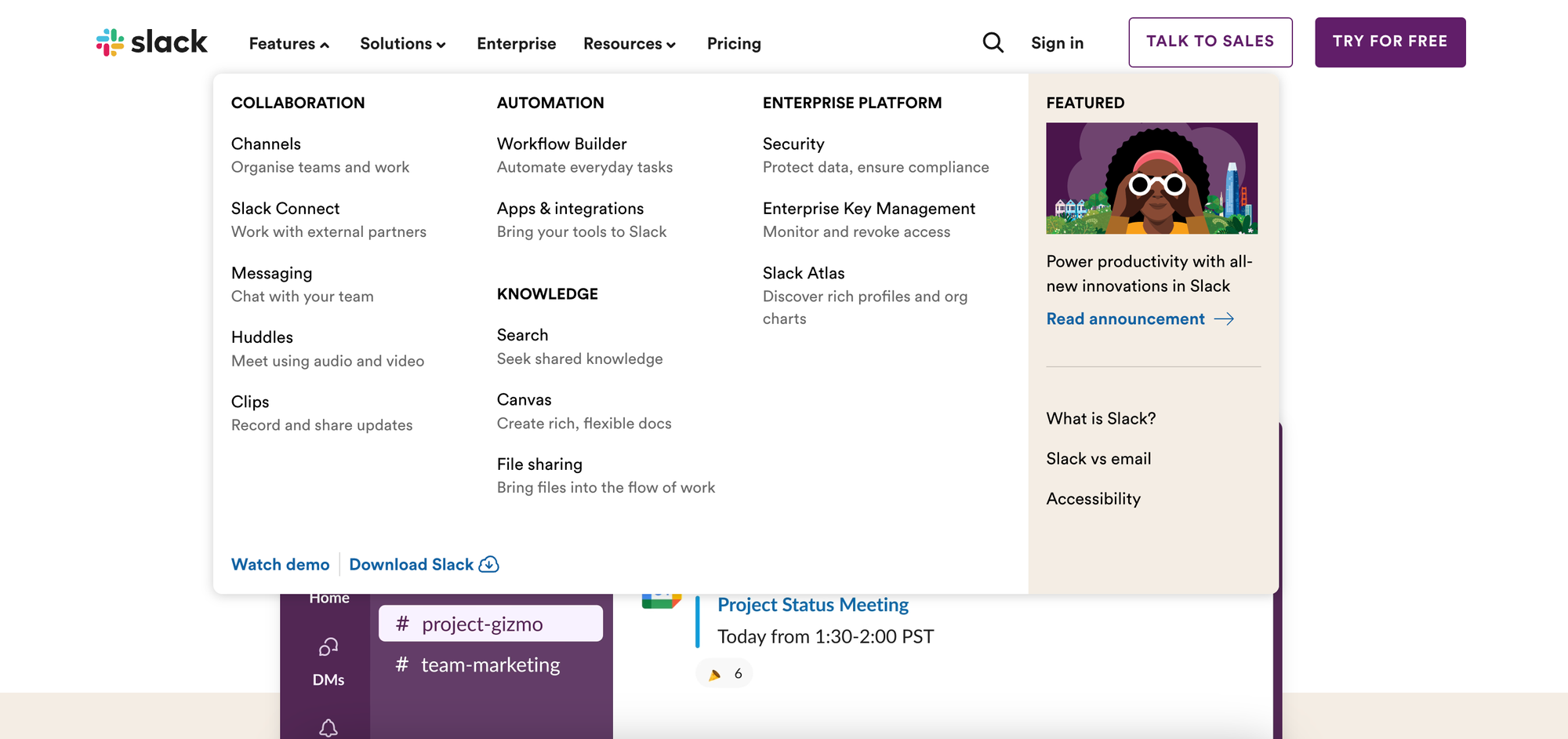 Slack is an online messaging application used by companies to connect and chat with their teams. It’s key that product managers can contact their team members as well as other co-workers, and Slack provides a platform to do so. PMs can not only send messages, but create channels to keep track of individual projects and their progress, in which they can provide relevant, streamlined updates.