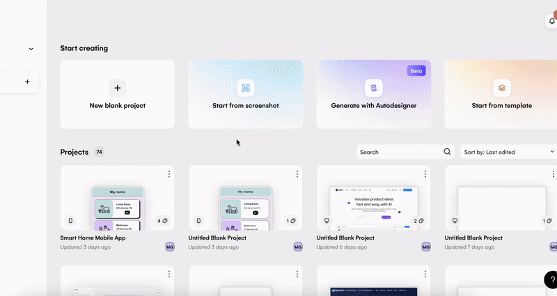 If you are already working on a project in the Uizard editor, you might want to add a new screen from a screenshot to create a user journey, or iterate on another product solution within the same project. To do so, you can either select the ‘Screenshot Scanner’ option from the magic tab, or use the ‘Generate Screens’ dropdown with the ‘Screenshot’ option in the Autodesigner widget at the bottom of the editor. Uploading your desired product design image will then mean you can iterate on a secondary screen in the editor.