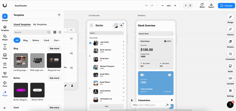 Autodesigner can tailor content, images and types of screens to the prompts that you use. For a stocks app design, you may want to use the prompts below: