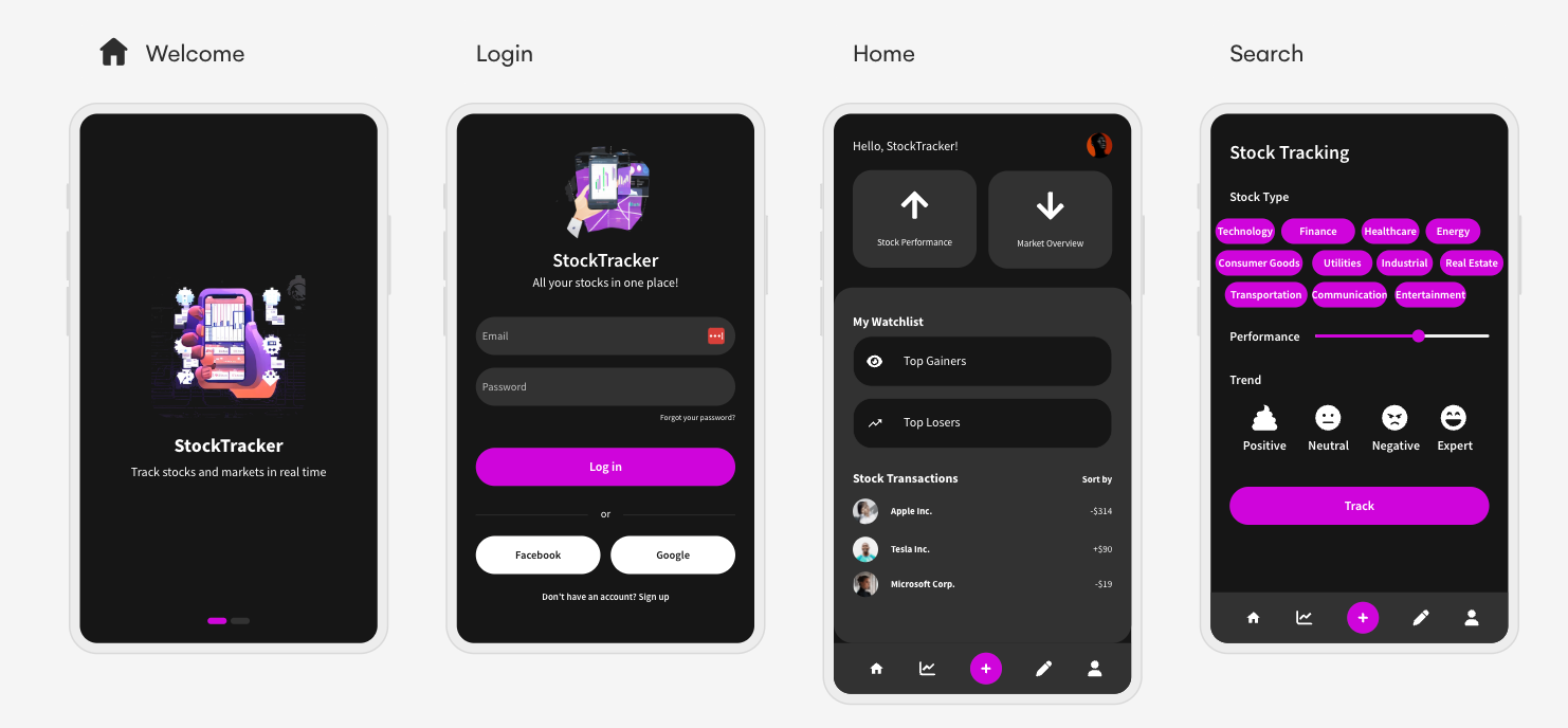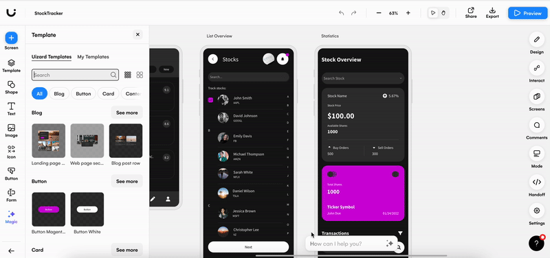 In this seven screen prototype, a dark theme was specified so the design screens are completely black — matching the prompt. There are also relevant screens such as a stock overview screen, a login and welcome page, and many more. This provides a great base to start designing and adapting a stocks app design in Uizard.