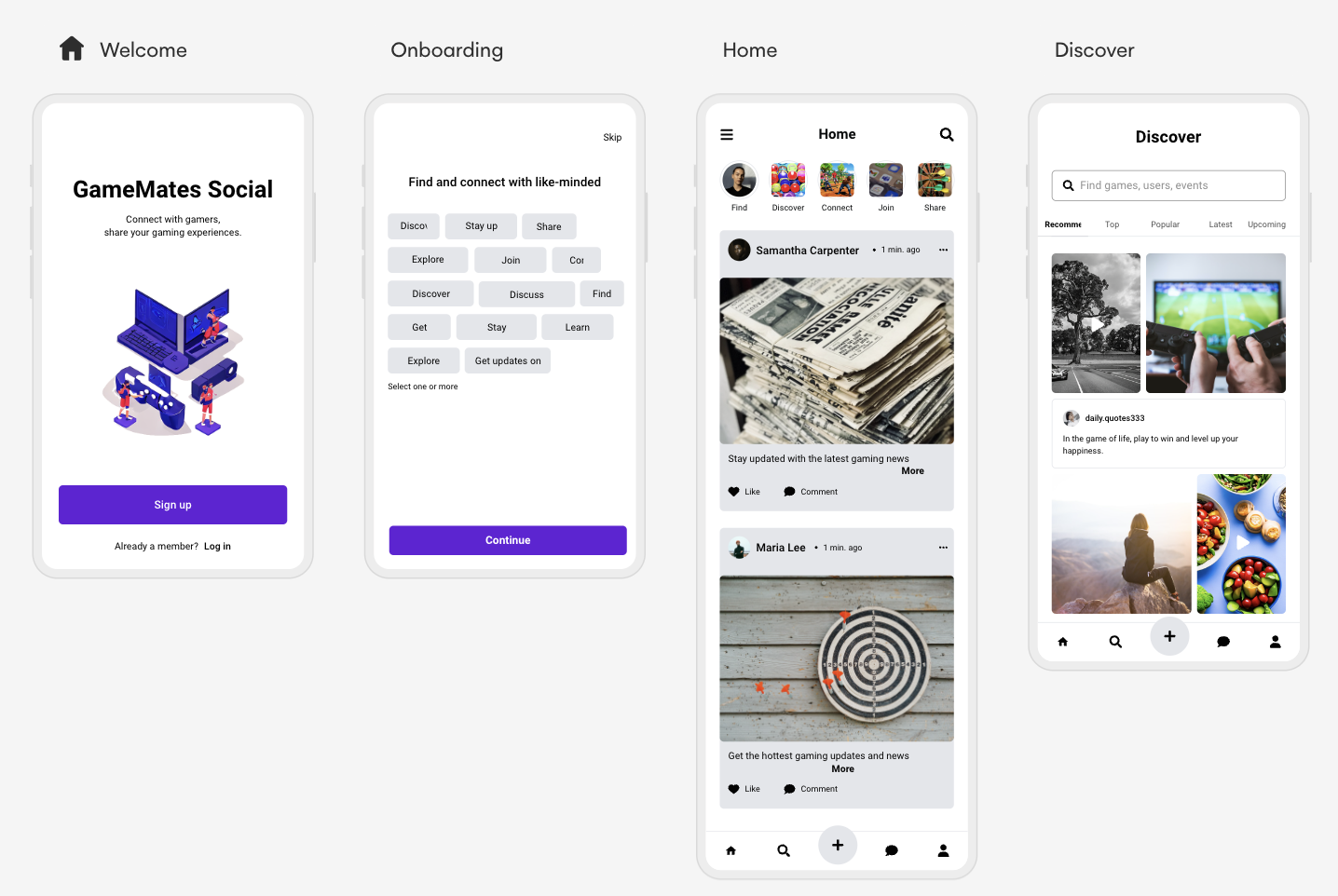 Using this button, these prompts generated a seven screen prototype, in the form of a social media app design but for gamers. The Facebook blue was replaced with purple, as specified in the prompt, and multiple on-topic screens were generated.
