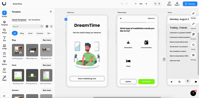 Creating high-fidelity mockups allows you to take your rough sketches and wireframes to the next level, it allows you to share with other stakeholders, gather feedback easily, and update your design to speed up the sign-off process. Building your mockup has never been easier with the power of Uizard. Our AI-powered features help you effortlessly transition from wireframe to mockup, and from mockup to high-fidelity, functional prototype.