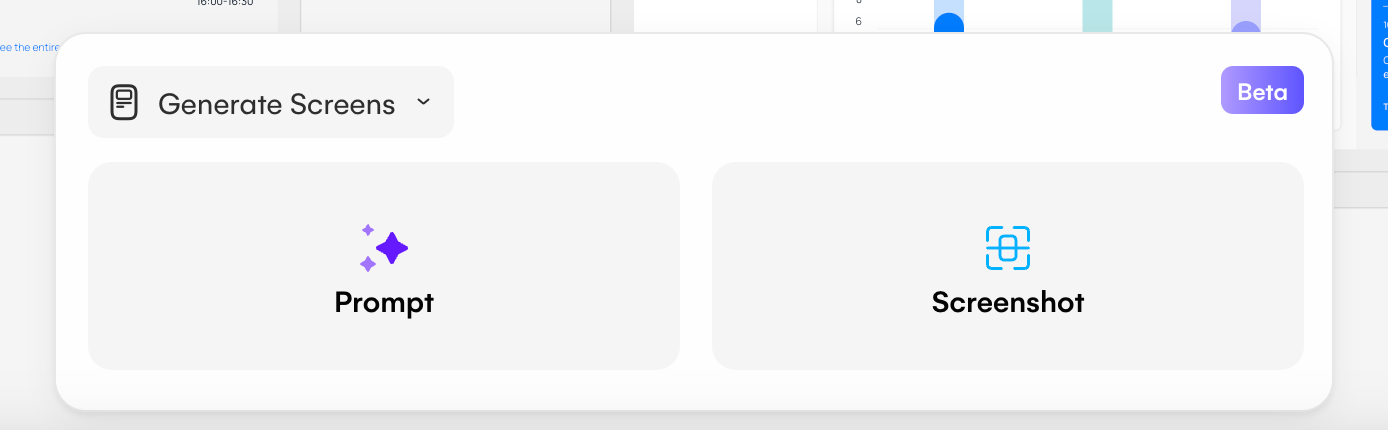 You can also expand your project and add new screens using the Autodesigner widget. All you need to do is select the ‘Generate Screens’ option, and pick from the prompt and screenshot features. Much like generating a whole project with Autodesigner, the prompt option will allow you to create single screen options from a simple text prompt. The screenshot feature however requires an image grab of a web design to generate a new screen. Both of these options are great for exploring new screens, and for providing extra inspiration.
