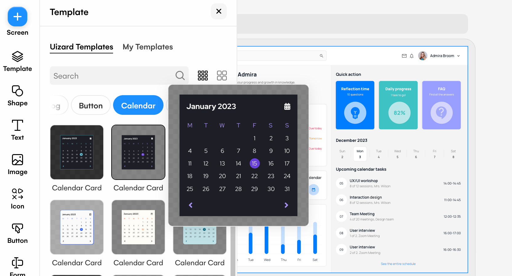 There is an option in the Uizard platform to start with a completely blank design screen, and from here you can add elements and components to start creating your website mockup. The left panel contains a UI components library, full of premade components that you can drag-and-drop onto your design screen. With elements such as icons and buttons at your disposal, your mockup is sure to take form in no time at all.