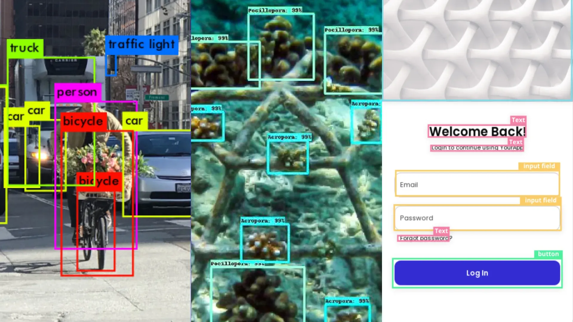 With screenshot converter, to turn a screenshot into a UI, we deal with a problem called object recognition, where we want to find a bunch of components in a given screenshot (buttons, input fields, icons etc.). This is the same problem solved by self-driving cars or tracking algorithms that monitor the health of the coral reef.